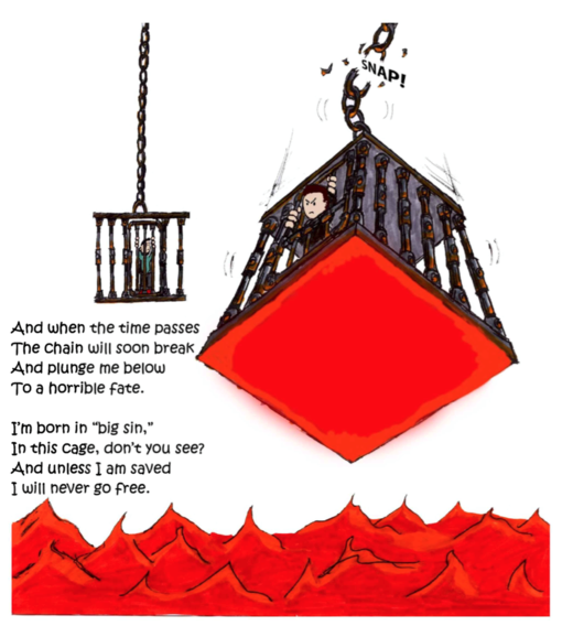 Clearly, this is imagery adapted from Jonathan Edwards’ Sinners in the Hands of an Angry God. In anticipation of those who object that subjecting a child to such terrifying imagery is inappropriate, the author appends a brief apologetic: