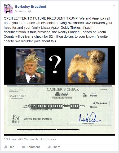 Cartoonist Berkeley Breathed — Bloom County, YAY! — has offered a $2,000,000 donation to Donald Trump’s favorite charity if he provides proof that his hair wasn’t transplanted from his Lhasa Apso.