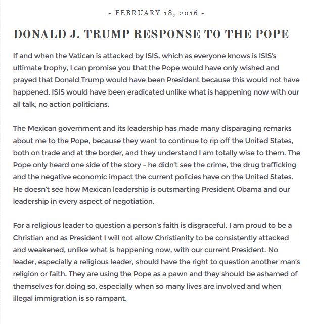 So, anyway, The Pope’s criticism of The Donald was on the money — and The Donald is some kind of peeved about it. I downloaded this from Trump’s Web site, by the way, so unless it’s been hacked this is authentic.