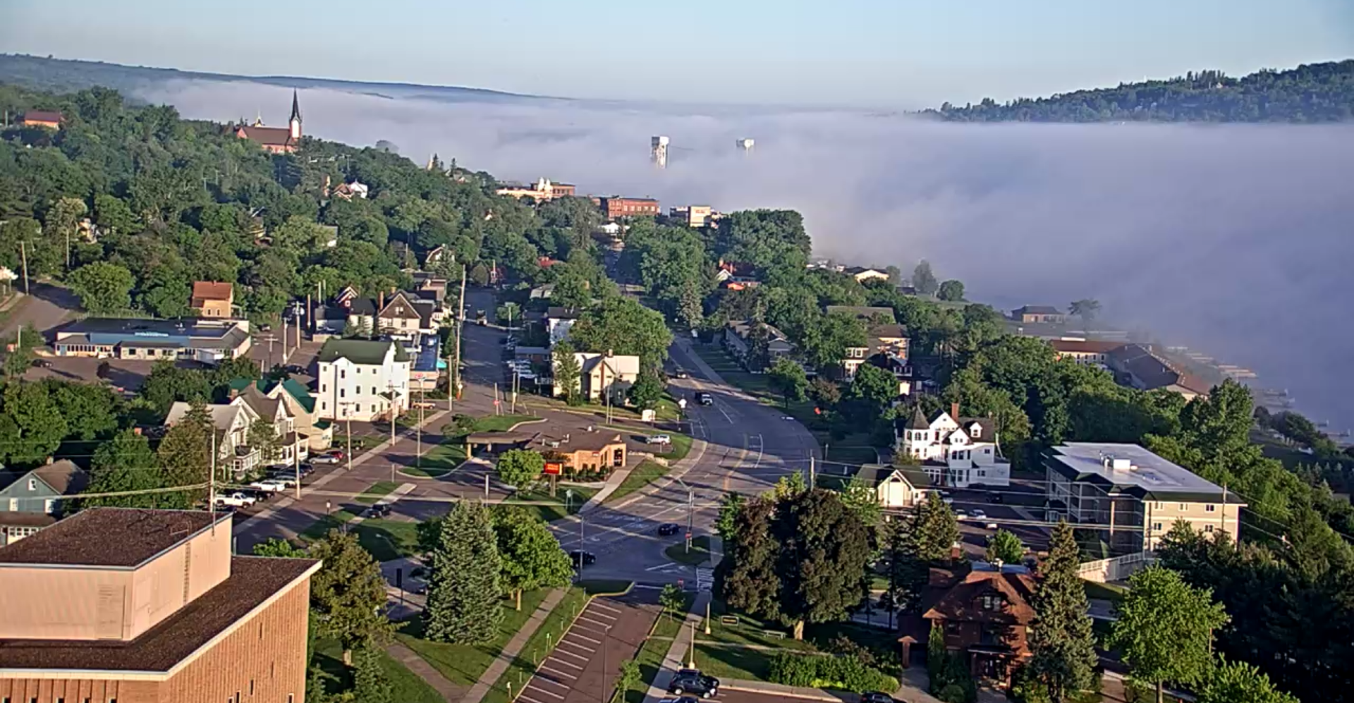 Fog rises off the Portage near Michigan Tech